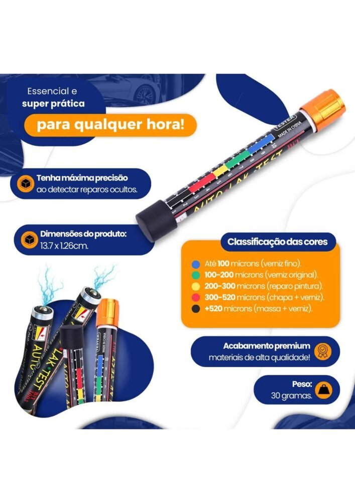 Garanta precisão e praticidade na avaliação da espessura da pintura com a nossa Caneta Teste, ideal para funilaria. Desenvolvida para profissionais e entusiastas, essa ferramenta é perfeita para medir a massa de pintura em veículos e superfícies metálicas, facilitando inspeções e garantindo a qualidade do acabamento.