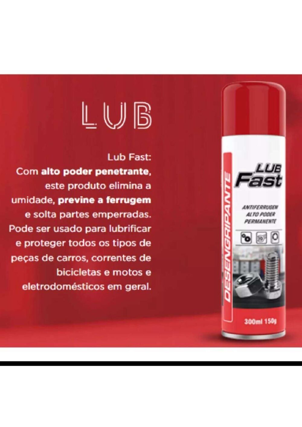 O Desengripante Lub Fast possui aplicação simples e eficaz. Pode ser utilizado em diversas áreas, como peças mecânicas, equipamentos, ferramentas, veículos e superfícies metálicas em geral. Sua fórmula especial lubrifica, desengripa e protege contra a corrosão, ajudando a prolongar a vida útil das peças e equipamentos.