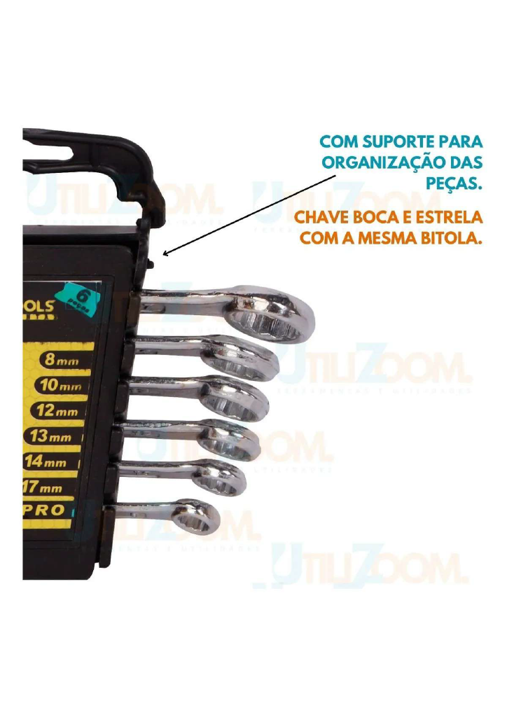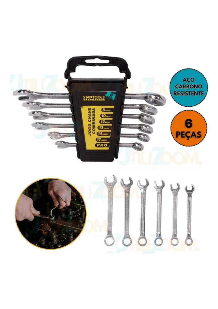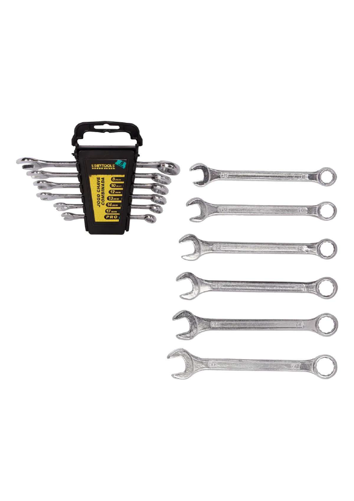 Material resistente e durável, garantindo uma excelente qualidade do produto!Conteúdo:• 6 Chaves Fixas / Chaves de Boca• Tamanhos: 6 x 7, 8 x 9, 10 x 11, 12 x 13, 14 x 15, 16 x 17 mm.• Acompanha suporte plástico para organização e transporte do conjunto.Essas ferramentas podem ser utilizadas em diversos setores pela sua versatilidade, sendo principalmente utilizadas no ramo automotivo e na manutenção de máquin