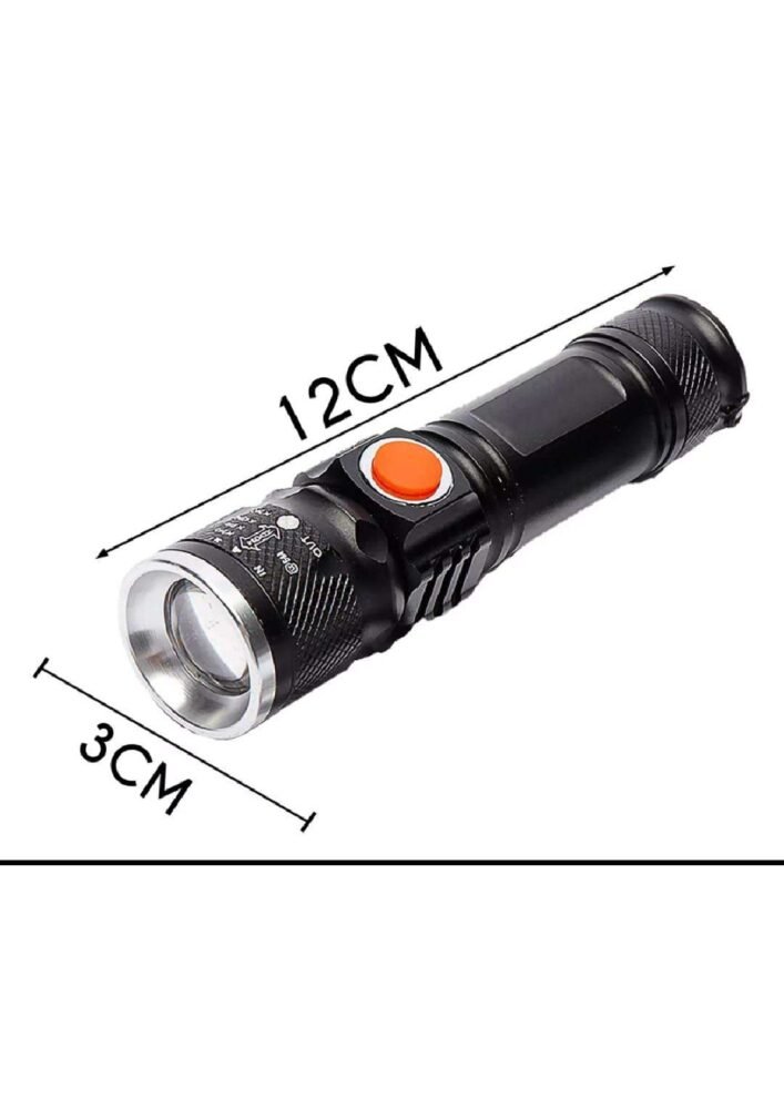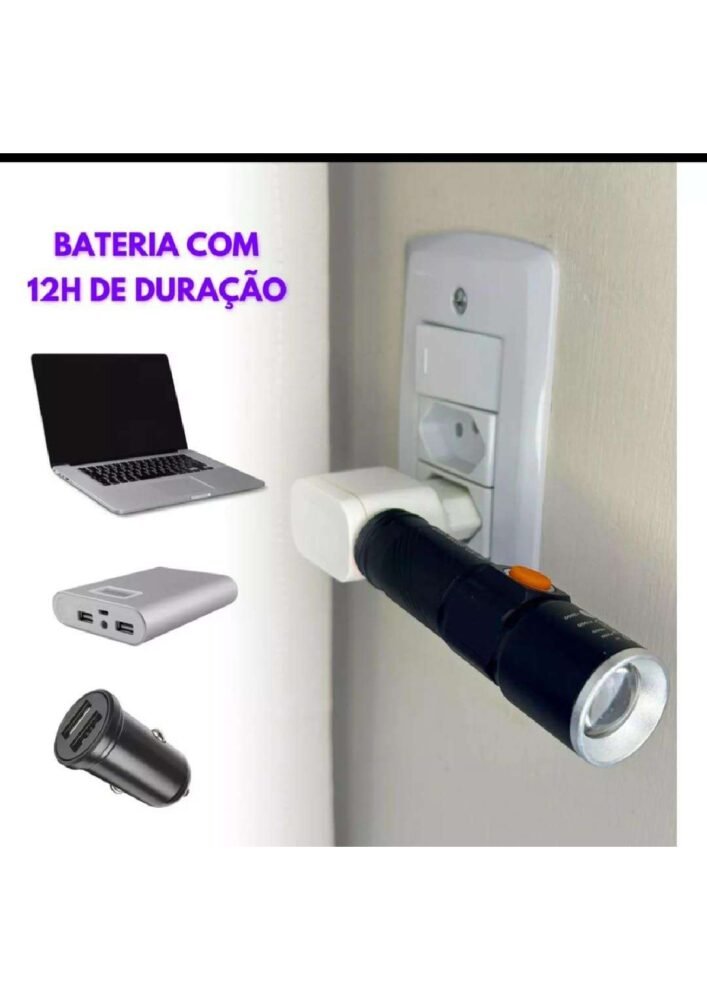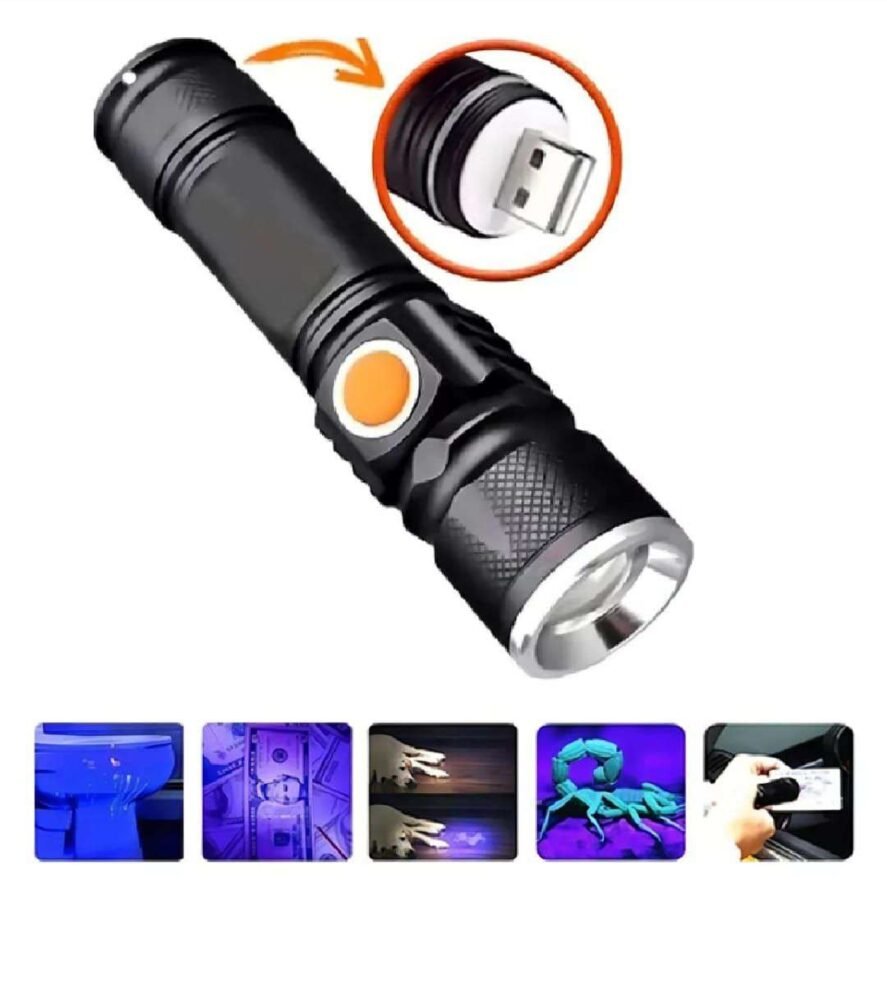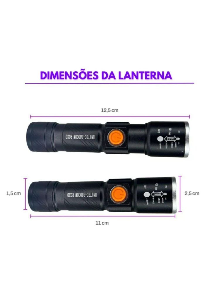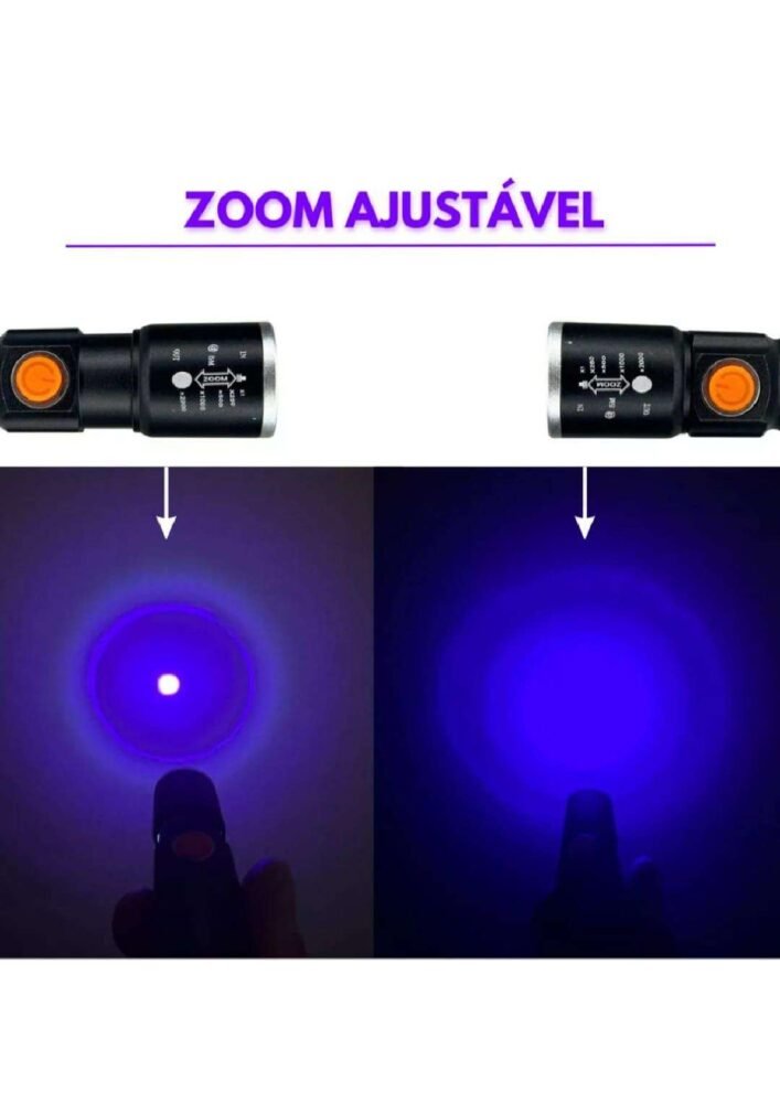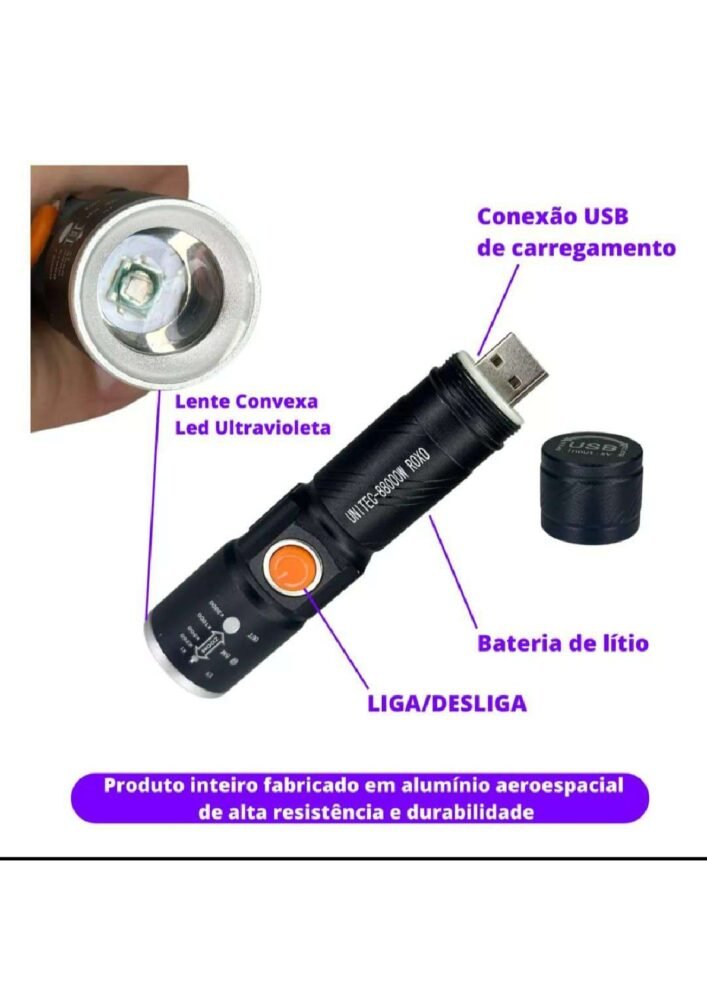 Lanterna led de luz ultravioleta, feita em liga de alumínio de alta qualidade. Durável e com design moderno e inovador; com três modos (forte, fraca e SOS), zoom ajustável telescópico e carregamento via USB (simples e prático).