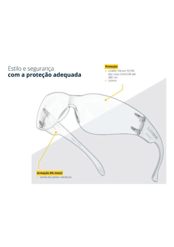 Os óculos de proteção SUMMER CLEAR da DELTA PLUS combinam estilo e segurança. Sua armação isenta de partes metálicas possibilita o uso em trabalhos com eletricidade. Oferecem proteção: UV400 que filtram 99,9% dos raios UVA/UVB até 380 mm, alto impacto e lateral.Utilizado em montadora, funilaria, auto mecânica, fundição, usinagem, serralheira, marcenaria, limpeza, logística, transportes, construção civil, agricultura, petroquímico, laboratório, aeroportos etc.