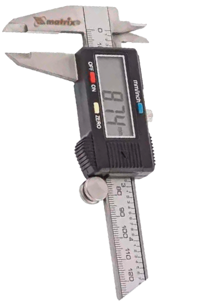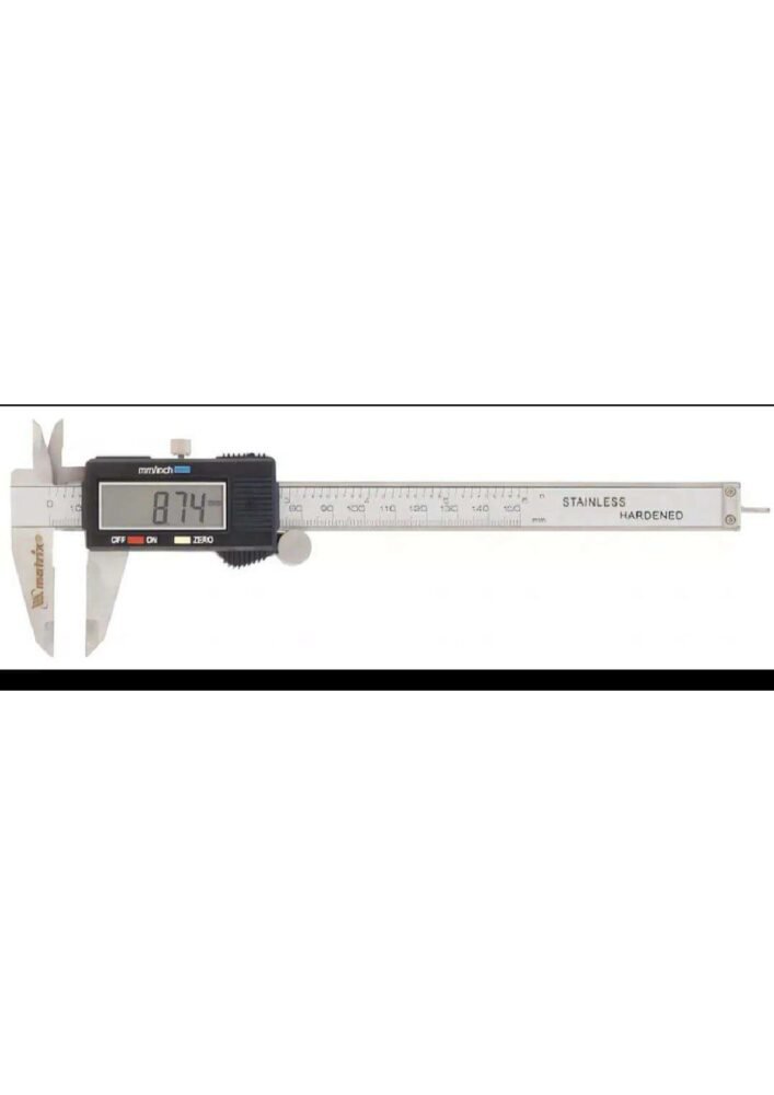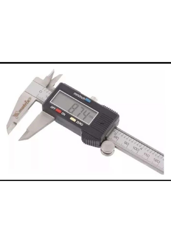 Paquímetro digital profissional de aço inox, com display LCD de alta qualidade. Medição em milímetros (faixa de medição: 1mm – 150mm). Acompanha certificado de calibração padrão RBC (Inmetro), estojo de plástico e uma bateria LR44 adicional.